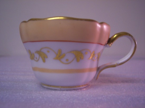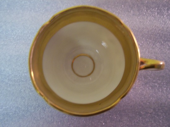 Four-lobed, round saucer of white porcelain decorated with a gold rim, orange band, gold band of leaves, orange band, and gold circle in the center. LHS sticky shield is affixed to the saucer's face. Cup is four-lobed, round with twin formed ear-shaped handle that's gilt on the outside. Deep gold band on inner rim. Same pattern repeated in same order from exterior rim as found on the saucer.