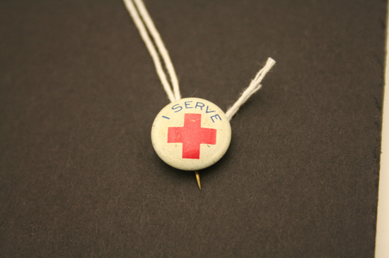 Round American Red Cross metal pin, white background, red cross in center. Above cross in blue lettering "I Serve" stick pin on back