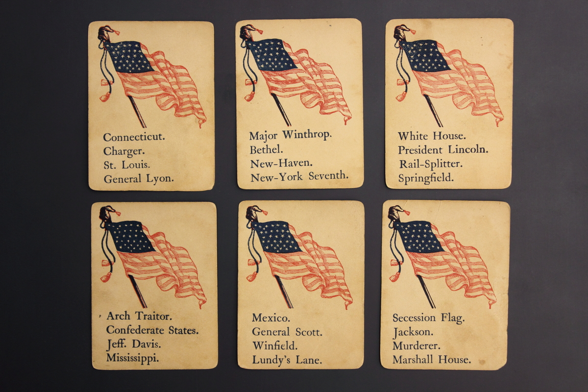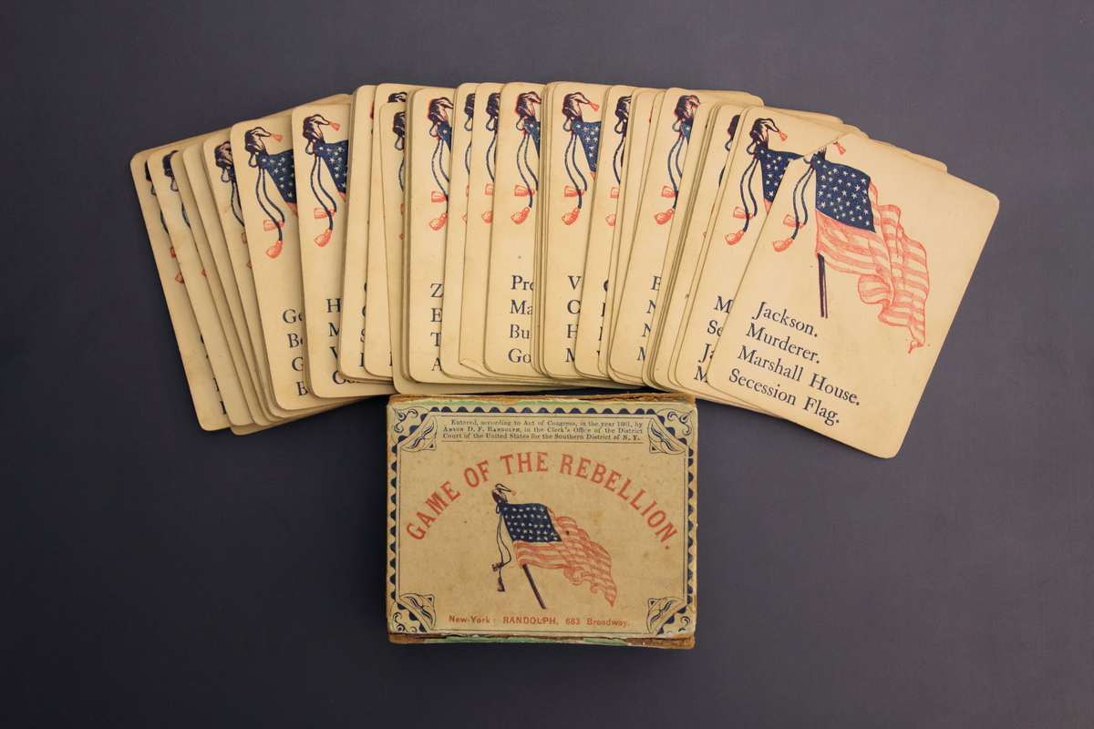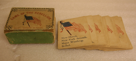 Cardboard box with separate lid. Printed on box lid - "Game of the Rebellion" with an American flag in the center. Printed underneath flag "New York: Randolph, 683 Broadway" Inside box is a stack of cards. Each card has an American flag printed on one side and names of Generals, battle fields, troops and geographical locations on the other side. 87 cards total.