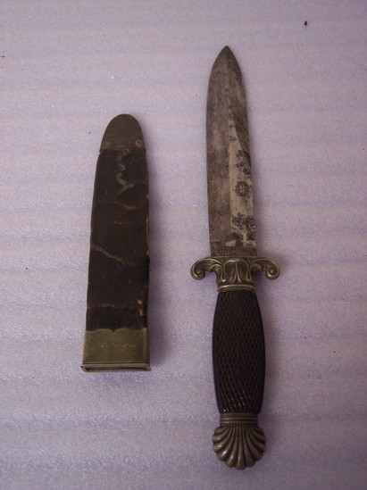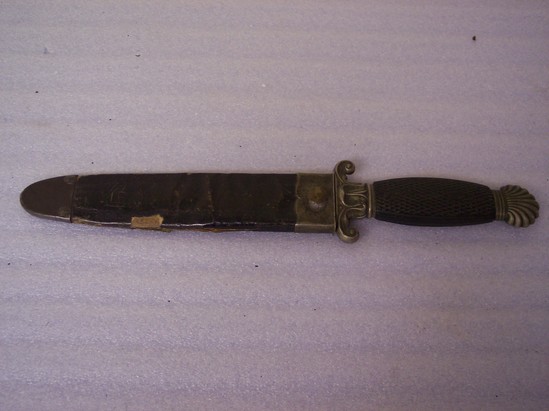 Bowie knife. Steel blade. Carved wooden handle with steel ornament on end of decorative shell. Bowie knife has round stamp on one side of blade "Cast Steel Bowie Knife" and printed near bottom of blade "Unwin & Rodgers/Celebrated/Make Sheffield" Leather sheath with iron tip and end. Button protruding from bottom of sheath to allow user to hook sheath onto belt. Leather impressed with decorative floral design.