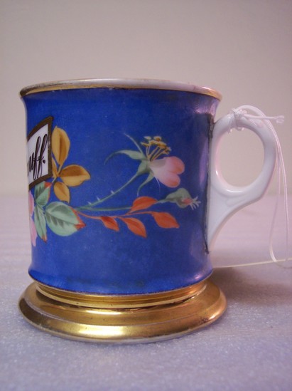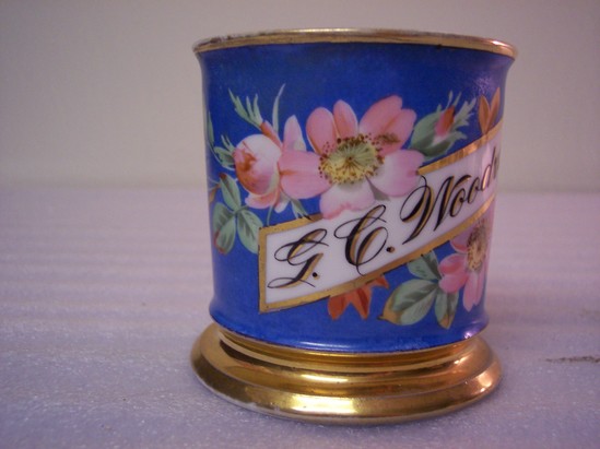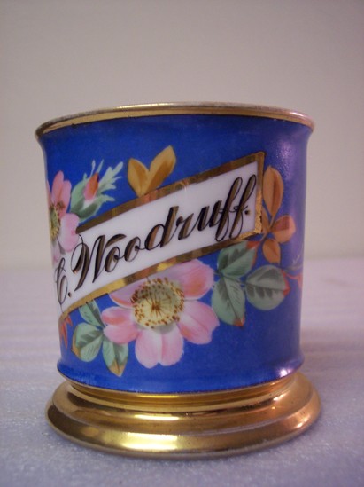 Polychrome and gilt decoration on shaving mug. "G.C. Woodruff" painted on one side of the mug.
