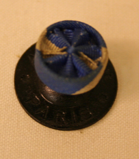 Round rosette covered with blue and white striped ribbon. Center of rosette has same silk ribbon bound in center with blue thread. Fanned out to fill center of rosette. Back by thin metal disk. Impressed into disk "Tiffany & Co. New York"