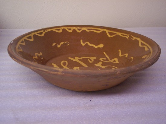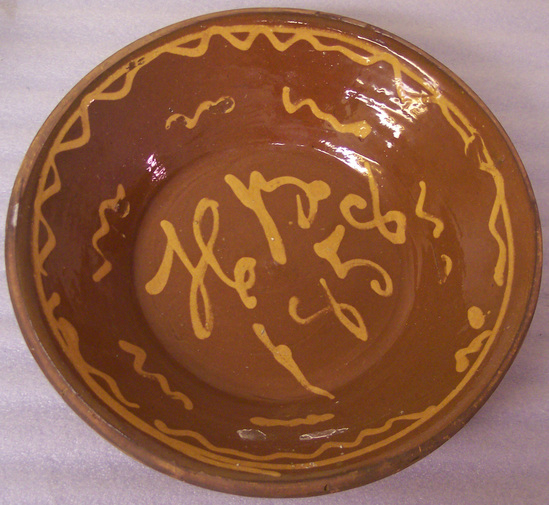 CLEAR GLAZED INTERIOR, WITH TRAILING LINES IN YELLOW SLIP, "HB/1858" ON BOTTOM INTERIOR OF PAN. EXTERIOR UNGLAZED. ROLLED RIM, PLAIN BASE