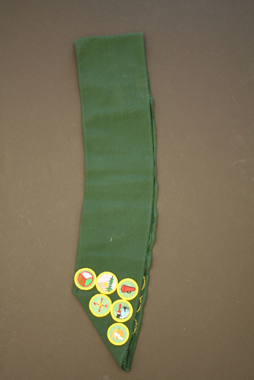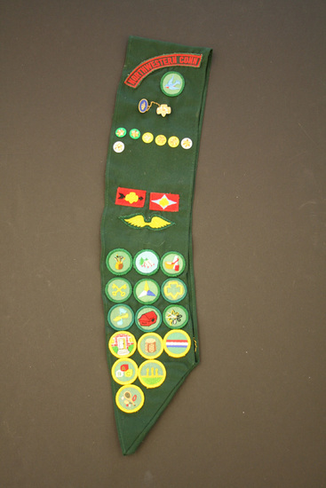 Green polyester sash. Sewn to a point at bottom. Front of sash decorated with patches and pins signifying various achievements within Girl Scout club. 6 round patches on back of sash. All patches are hand sewn to sash. 15 round patches 2 square patches 1 patch shaped like bird wings 7 star pins 1 banner patch "Northwestern Conn"