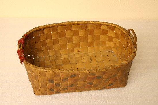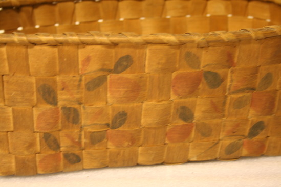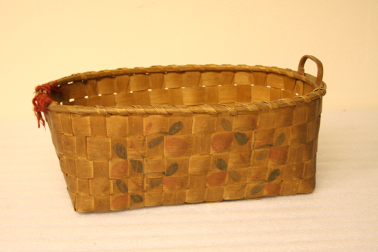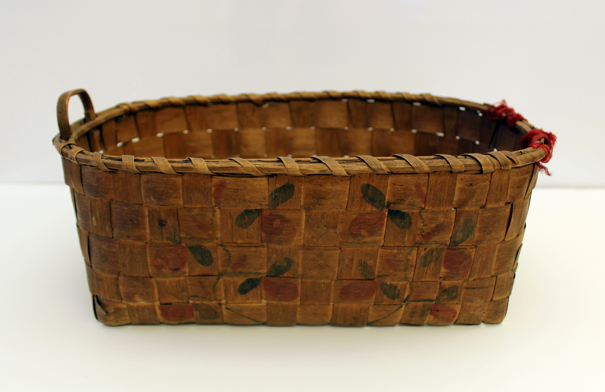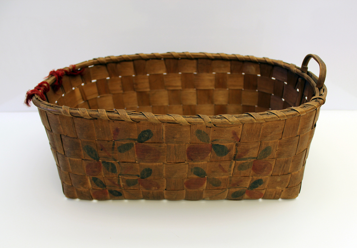 Large woven splint basket. On sides, red and blue potato stamp decorations. Carved loops handles. One handle missing