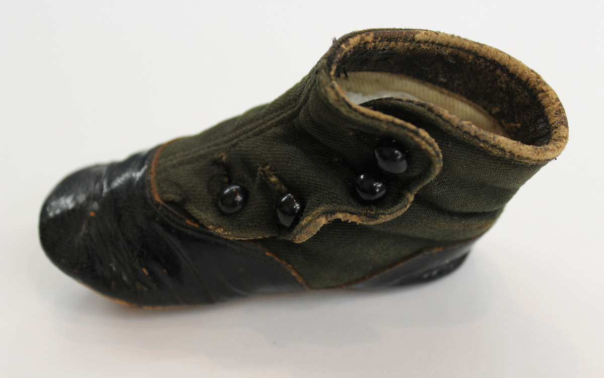 Black patent leather and dark green cotton canvas child's shoe; gaiter style; rounded toe; scalloped edge at opening with four buttonholes and glass buttons; tan cotton twill lining; tan leather piping at top edge; tan leather sole