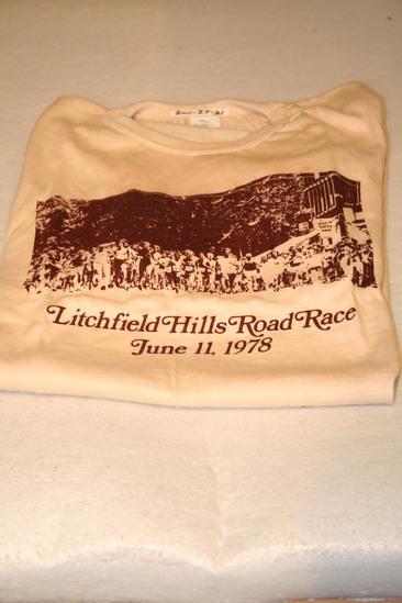 Tan short sleeved t-shirt. Logo on front center of shirt, printed in brown. Group of runners with "Litchfield Hills Road Race/ June 11, 1978" printed below.