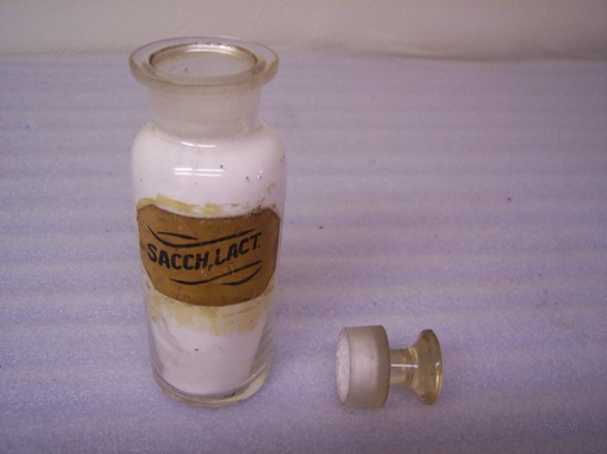 Clear glass apothecary bottle with stopper, paper label with black ink lettering "Sacch. Lact" - varnished over label. Remnants of white powder in bottle a: bottle b: stopper