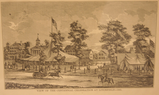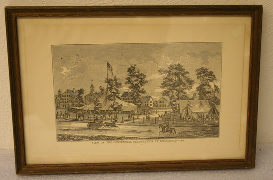 Black and white framed lithograph depicting a celebration on Litcfield's town green, taken from North side of West Street. Image with central tent pavilion, in the foreground a man on horseback and a couple in horse and buggy, background is West Street business district. Entitled below: "View of the Centen- -nial Celebration at Litchfield-1851". Print after an original drawing by Jules Busch. Page 252 cut from Kilbourne's History.