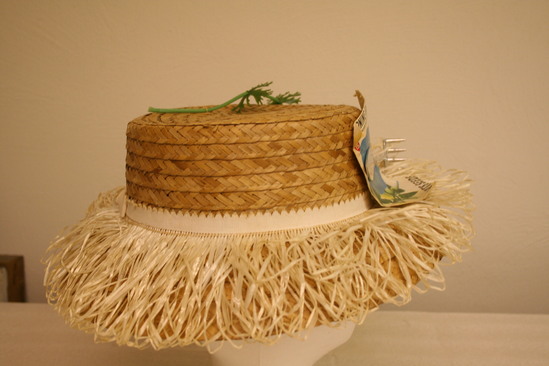 Circular straw hat with 2 1/2" brim; brim covered in white plastic grass; base of hat trimmed in white grosgrain ribbon; morning glory seed packet and silver spade/hoe attached to front; plastic whtie flower with purple center and green stem attached to right side