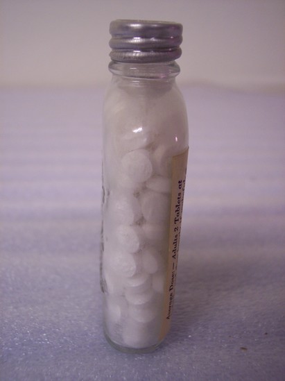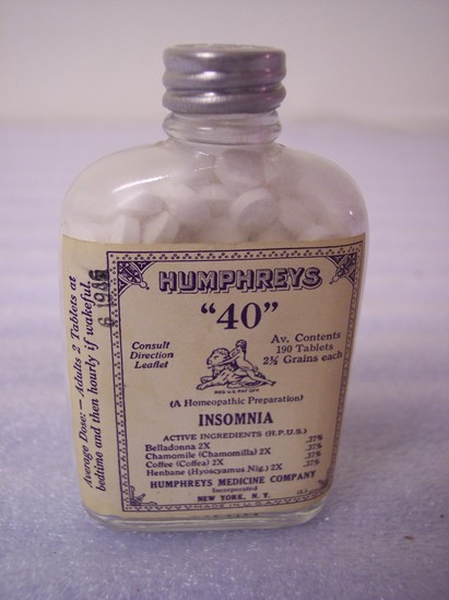 Clear glass bottle with label for "Humphrey's #40 Pills, a Homeopathic Preparation for 'Insomnia'/Humphreys Medicine Company, Inc./New York" Bottle full of white pills