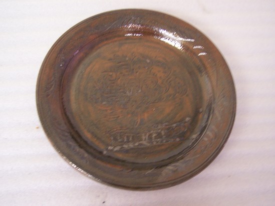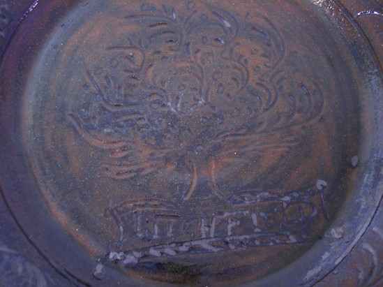 LARGE REDWARE CHARGER WITH FLARED SIDES. DECORATED WITH TREE OF LIFE MOTIF WITH THE WORD "LITCHFIELD" BELOW. LINEAR LEAF DECORATION ON INTERIOR OF SIDES. LEAD GLAZED SURFACE HAS PRODUCED A TORTOISE SHELL EFFECT OF REDDISH AREAS INTERSPERSED WITH DARK BROWN/BLACK SPLOTCHES. UNDERSIDE IS NOT GLAZED, AND INSCRIBED "GUY WOLFF 2000." ONE OF THREE REDWARE CHARGERS MADE. THE OTHER TWO HAD A SHIP MOTIF. ONE WAS GIVEN TO THE DECORATOR/DESIGNER MARTHA STEWART AS A GIFT. tHE OTHER WAS OFFER TO THE PEABODY ESSEX MUSEUM IN SALEM, MA, AND REFUSED.