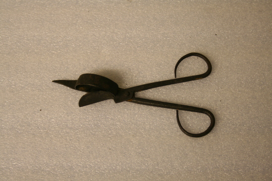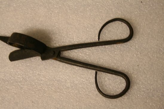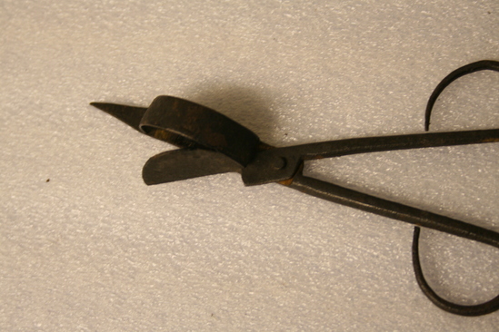 Wrought iron scissor-type candlesnuffer. Rounded snuffer plate
