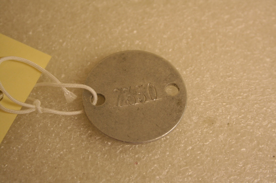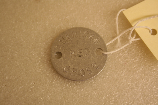 Silver colored round metal tag. "American Red Cross" embossed on 1 side. "7350" embossed on the other. Holes on either side.