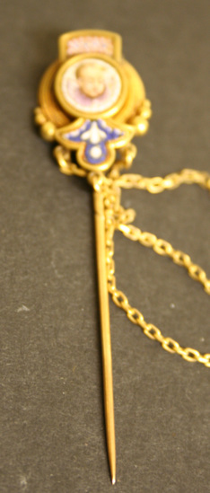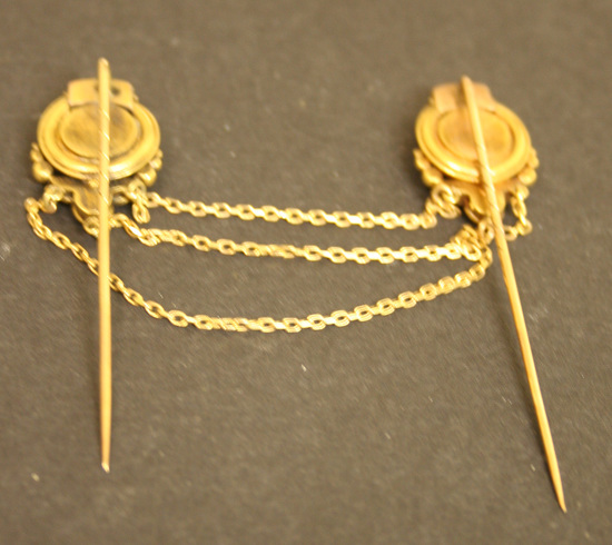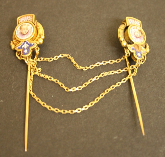 Two stick pins joined to each other by three varied lengths of gold chain. Long pin back with 1/3 spiral grooved. Background of each pin concentric circles of twisted gold rope with box at top containing red, white and blue mosaic chips in geometric pattern, center a round gold box with cherub heads and wings facing each other from each pin. Beneath the tondo is a fleur-de-lis shaped box with blue and white floral chips.