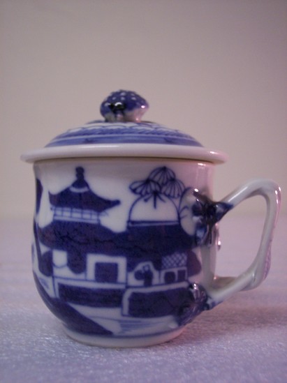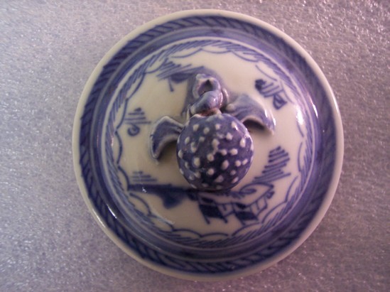 Ramekin (A) is small and pot-bellied with a two-strand woven handle. Lid (B) has a raspberry knop. Ramekin has a Asian scene in blue and white of two houses, trees, and birds.