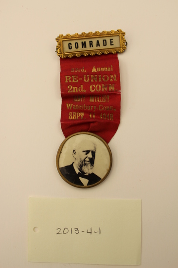 Three-piece G.A.R. reunion medal. Yellow metal bar pin at top with "COMRADE" label. Printed red silk ribbon: "53rd Annual / RE-UNION / 2nd.CONN. / HEAVY ARTILLERY / Waterbury, Conn. / SEPT. 11, 1918." Ribbon gathered into a button with a black and white photograph of a bearded man in a black suit and bow tie - the commander of the G.A.R. unit at the time of issue. Paper label at reverse of photo button.