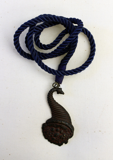 Dark blue braided rope with satin ribbon twist at end. Metal loop at end of rope attached to a metal emblem. Emblem made from cast lead in the shape of a cornucopia. Remains of red paint on front.