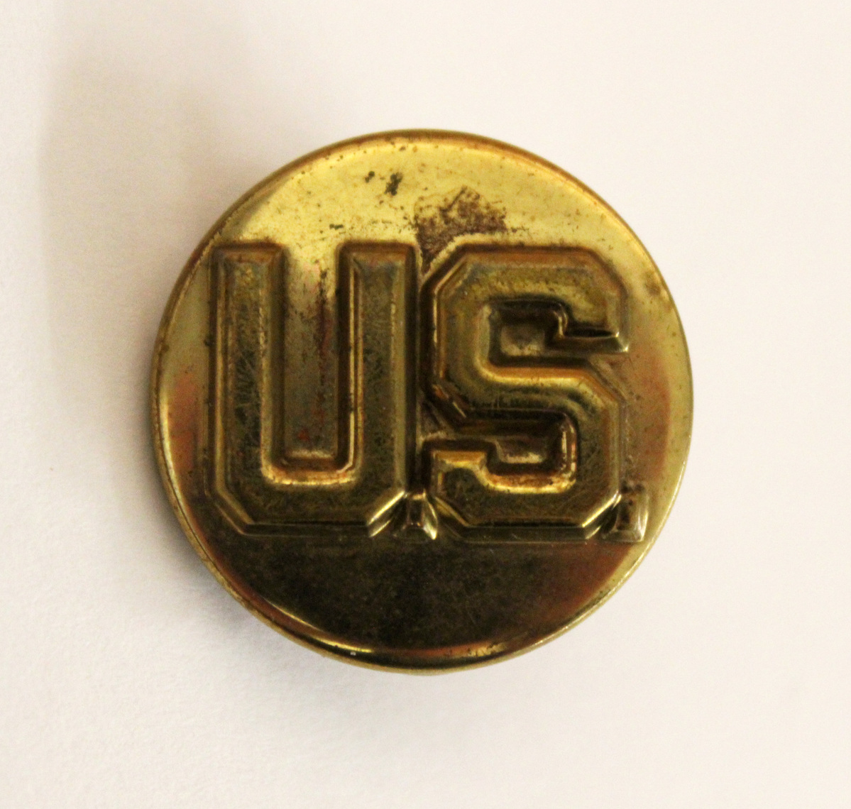 World War II era pin, U.S. Army. Circular brass pin with raised lettering, "U.S." Two pin backs attached at reverse.
