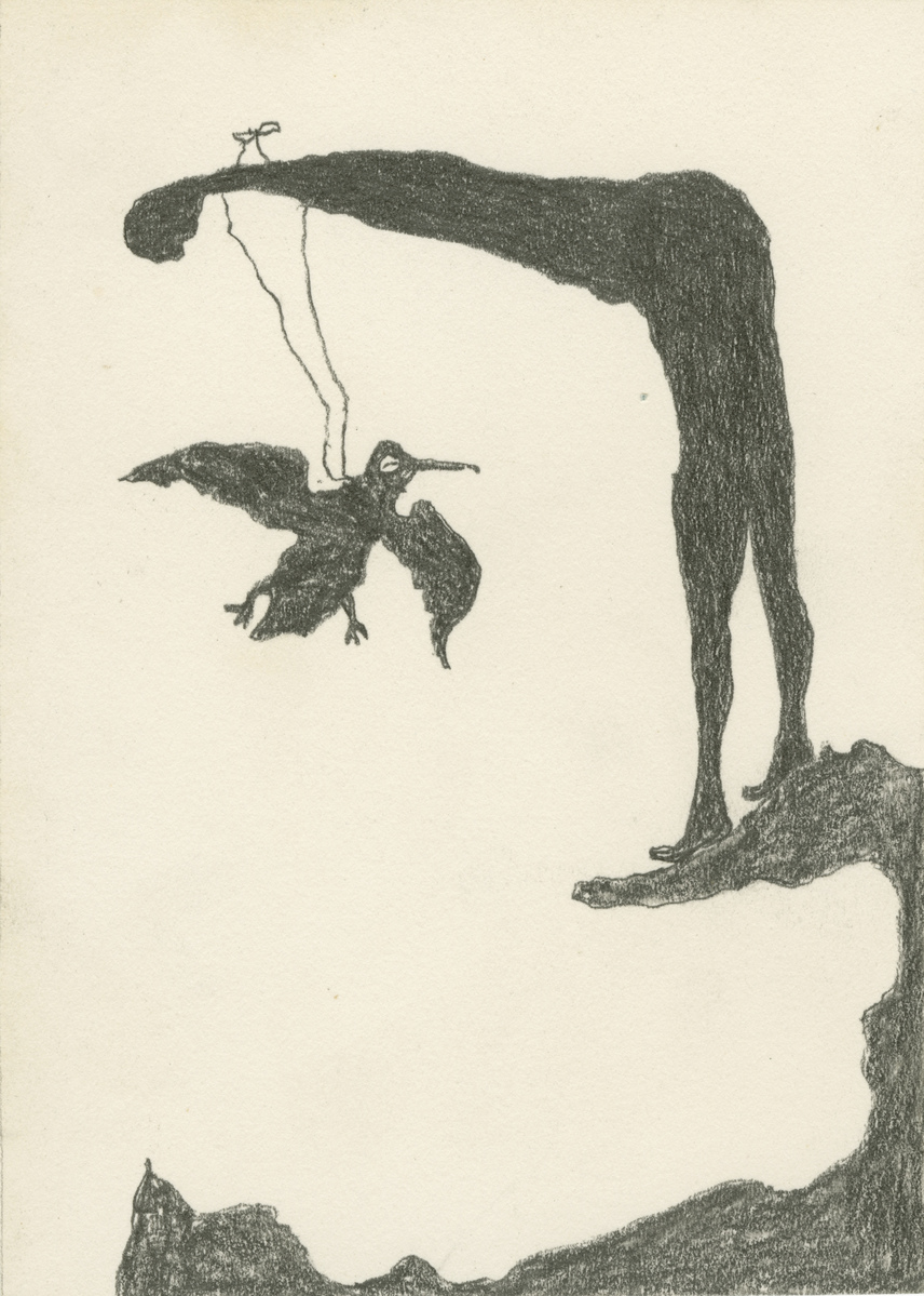 Artist crayon or graphite drawing on off-white paper. Drawing shows an abstract figure standing on a cliff or the edge of a raised surface. The figure's neck and torso are elongated and bent to the left. From the figure's neck hangs a bird shape from two thin lines. Drawing is unsigned.