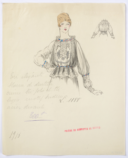 Lithograph and watercolor on paper fashion design. Rendering depicts a lace blouse with an embroidered metallic design on the front.