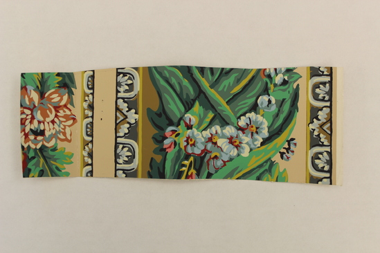 Wallpaper sample strip with peach background. On the left is a red rose with blue and white accents and green and yellow leaves. To the right is a stripe with blue and white rectangles and semi-circles, a peach stripe, a blue stripe with blue and white squares and triangles, a wide stripe with a blue and white floral pattern and large green leaves, and another stripe with blue and white squares and triangles.