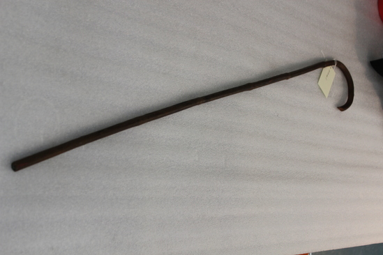 Cane with handle, shaft and tip from one piece of wood; the handle is curved like the top of a shepherd's crook.