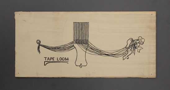 Illustration on board executed in pencil and black paint. Artwork depicts a tape loom.