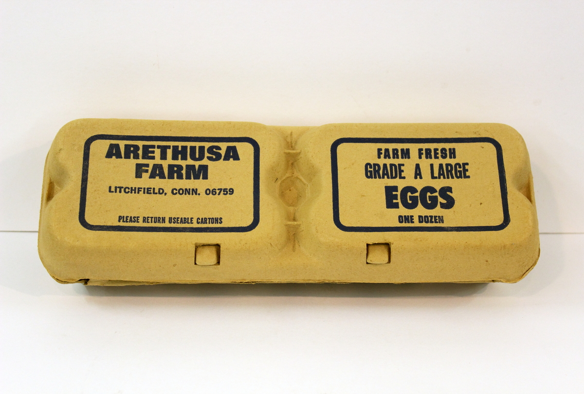 Egg Carton produced for Arethusa Farm, Litchfield, Conn. Tan egg carton made of molded paper pulp with hinged lid and 12 compartments. On top-left, printed blue text set in blue border, "ARETHUSA/ FARM/ LITCHFIELD, CONN. 06759/ PLEASE RETURN USABLE CARTONS", on top-right "FARM FRESH/ GRADE A LARGE/ EGGS/ ONE DOZEN".