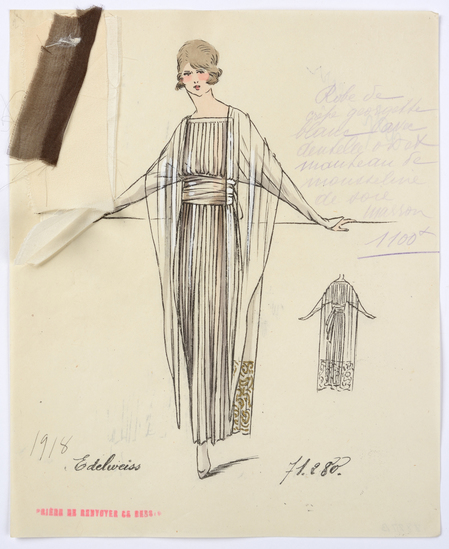 Lithograph and watercolor on paper fashion design. Dress of white "georgette" crepe with gold and a coat of silk chiffon. Fabric samples accompany rendering.