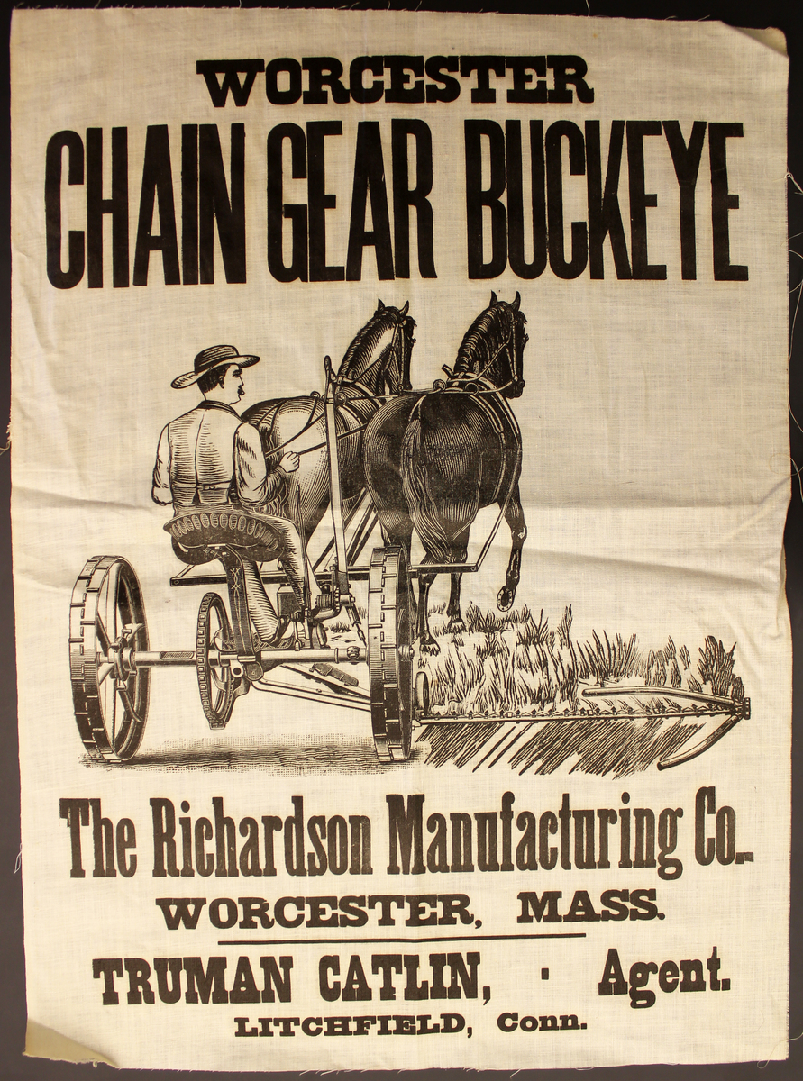 Printed advertisement designed to be sewn to the front of a seed or flour bag. Glazed white cotton with black ink lettering and image. At top, "WORCESTER/CHAIN GEAR BUCKEYE"; at bottom, "The Richardson Manufacturing Co./WORCESTER, MASS./TRUMAN CATLIN, Agent/LITCHFIELD, Conn." At center, image of a man riding a mower drawn by two horses.