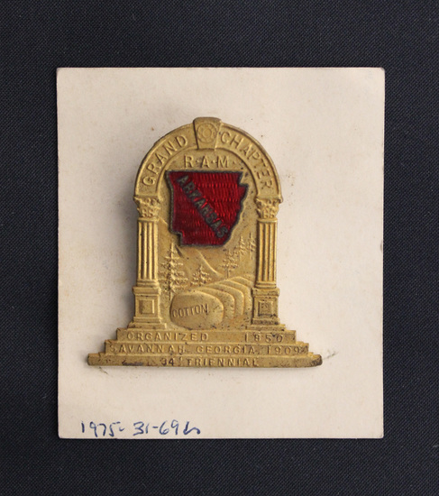 Gold Masonic pin shaped like stars with two pillars and an arch at the top. "GRAND CHAPTER" stamped across arch. Central panel decorated with a scene showing mountains, evergreen trees and a bale of cotton. Red enamel outline of the state of Arkansas below arch. "ARKANSAS" in tarnished gold across state outline. "R.A.M." stamped above state. "ORGANIZED 1850 / SAVANNAH, GEORGIA 1909 / 34 TRIENNIAL" stamped across steps.