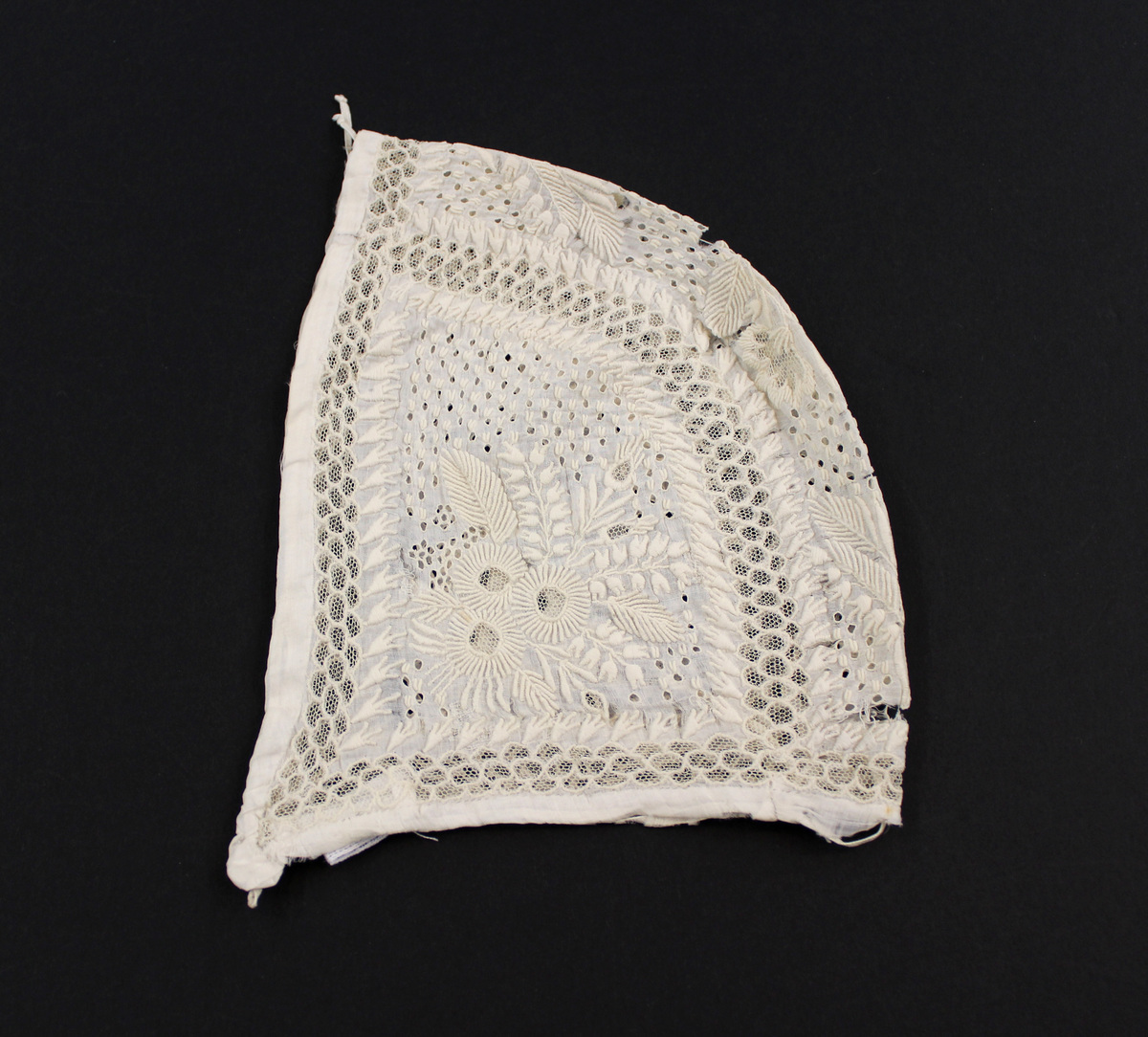 Off-white overall floral white work embroidered child's bonnet; net needle fillings; drawstrings at top center and back; loops at sides