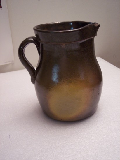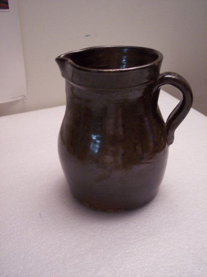 Brown pitcher - stoneware with dark brown glaze. Squat body which is widest at the middle. Lip around edge of pitcher. Divet on one side of opening to allow liquid to be poured. Handle on one side, small, ear shaped. Glaze uneven on one - large light spot where stoneware is visible