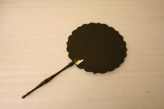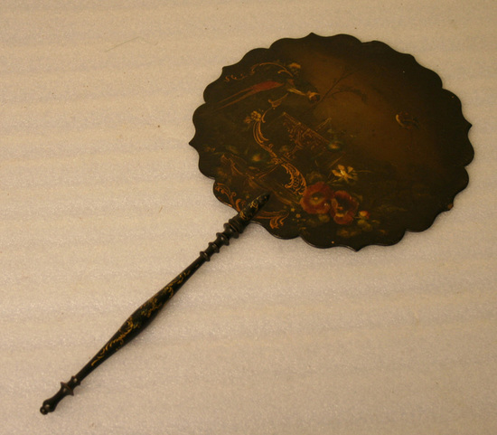 Wooden fan - flat round wooden board with sculpted edge. Thin turned rounded handle. All painted in black laquer. Front of fan has papier mache and painted design of exotic fountain with parrot on one side and colorful exotic flowers underneath. Handle has scroll design painted in gold leaf.