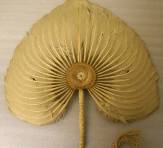 Fan of palm shaped field of white feathers attached to handle of carved ivory. Carvings of flowers, knobs and leaf design. 1/2" diameter silk cord and tassel attached to bottom of handle. At center of feathers is a mother of pearl button in shape of a flower, 3/4" diameter.