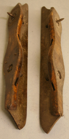 Pair of ice skates. Straight iron blade that extends just past body of skate on either end. Wooden base to skates shaped to conform to shape of foot. Large iron screw protruding upward from heel. Three rectangular slits cut through body of skate on sides where leather straps would be laced - straps missing.