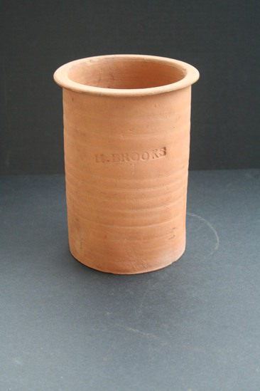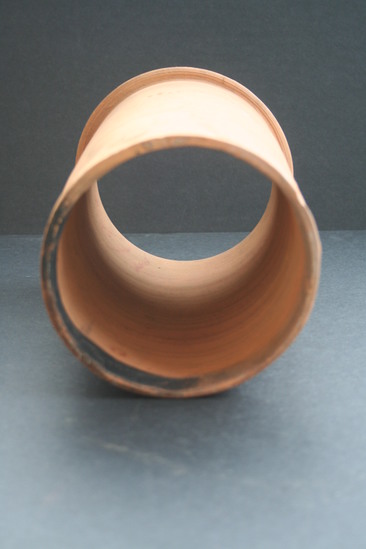 UNGLAZED, STRAIGHT-SIDED POTTERY TUBE WITH A ROLLED AND FLATTENED RIM, NO BOTTOM.