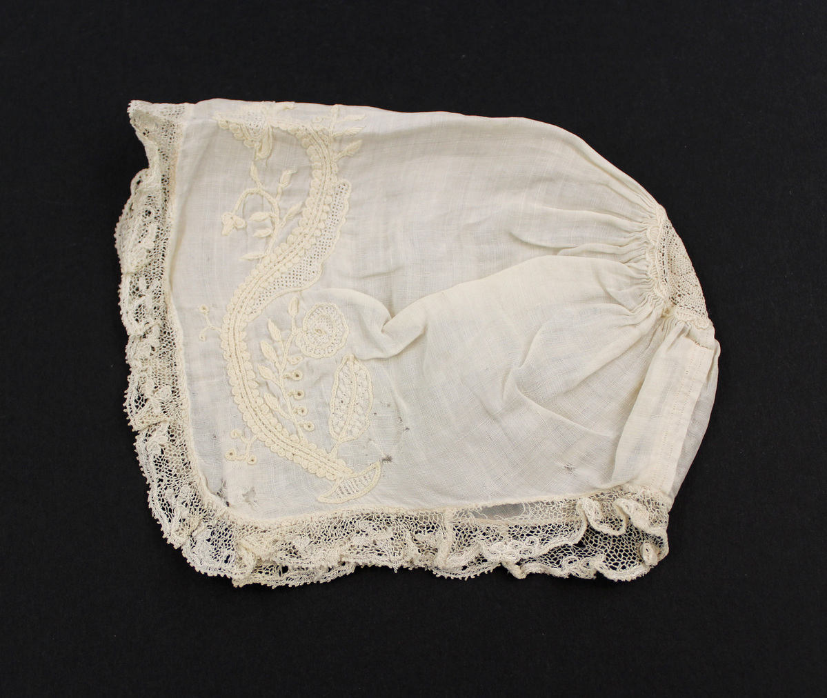White sheer cotton child's bonnet; embroidered; lace ruffle along edge; circular lace insertion at crown, no ties