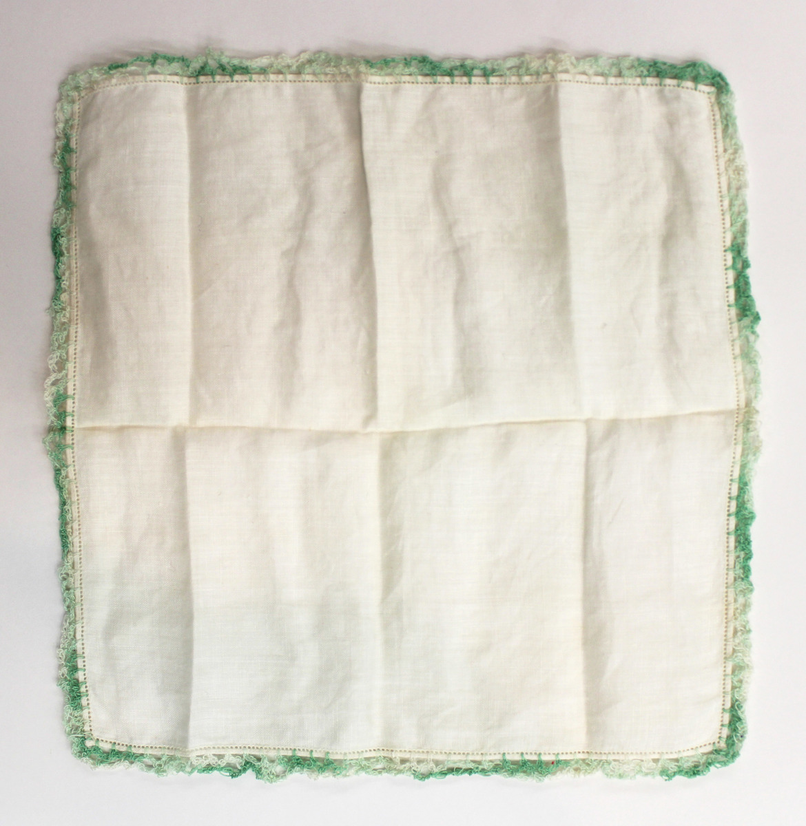 Off-white linen square handkerchief. Green, variegated thread crochet trim on all sides.