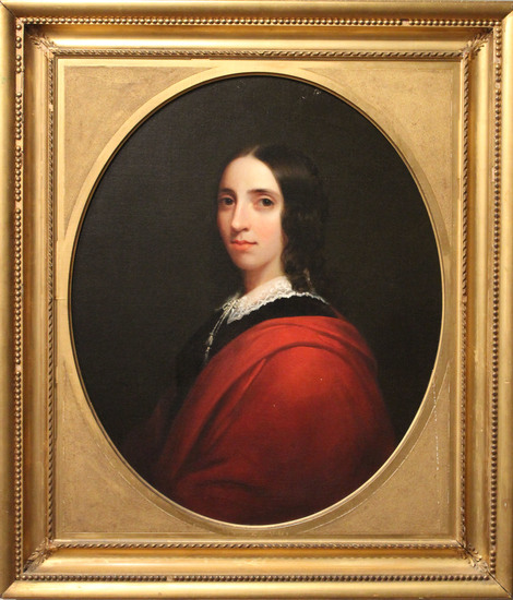 Oil on canvas portrait of Minerva Harrison Dunham. 1/2 length image of a young woman, dark brown hair with ringlets, brown eyes, wearing a black dress with white lace collar and red cloak.