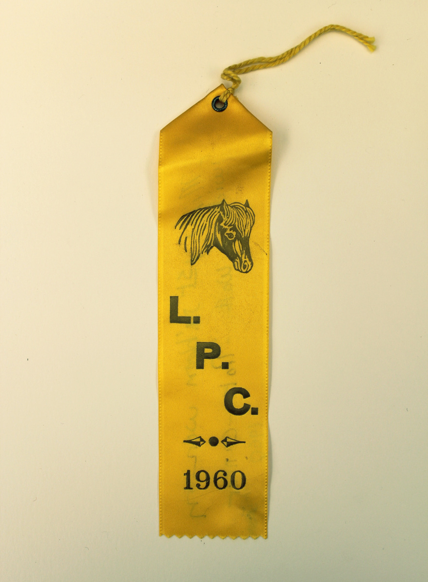Yellow satin ribbon with triangular fold and metal eyelet at top. Printed on one side in gold ink is image of a horse's head with lettering, "L.P.C./1960" (Litchfield Pony Club). Yellow thread strung through eyelet. Written in pencil on reverse, "Mimi 1st ribbon won on/Twidle Walk-Trot-Canter/11-years/1960."