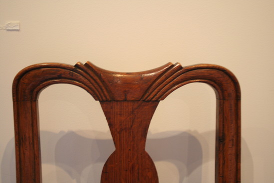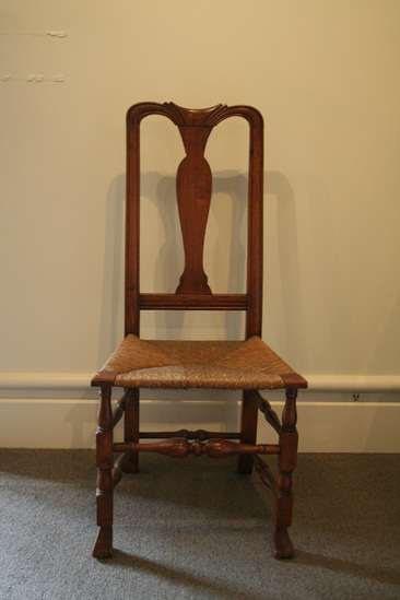 Queen Anne style side chair. Spanish style front feet. Front legs turned - oblong block, turning, block, and turning to flat block level with seat on front legs. Front stretcher turned with rings, grooves and center ring burning. Double turned side stretchers. Plain single back stretcher. Canted square profile back leg through seat stile with beaded edge with yoke top with four side reeds. Vase splat with tapered edge on back. Grooved and reeded bottom rail.