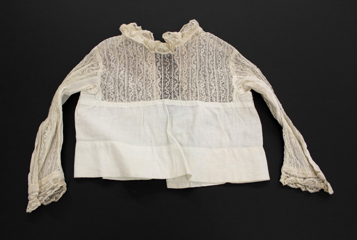 White cotton child's bodice; round neck with lace ruffle; long sleeves of lace and cotton with lace cuffs; front and back yokes of lace; cotton bottom section; center back opening with buttonholes, no closures