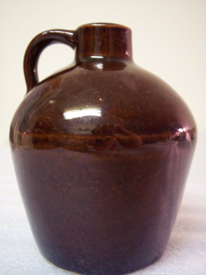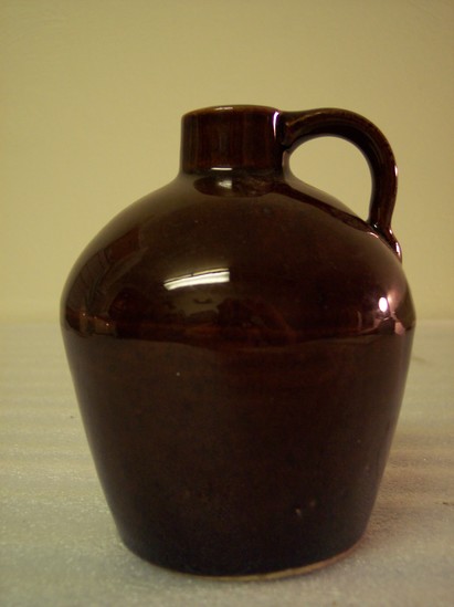 Dark brown glazed jug with attached handle at narrow rim and top of body. Narrow, straight neck with bulbous body, plain base. Slight incised line at shoulder. Had tag attached to handle (see file for tag) with braided cotton string (orange and black). It read "The little brown jug is of baked clay and comes from an old potter whose hands did not shake. He and his forbears have made these jugs for two hundred years. Roycroft Products Co., East Aurora, NY." Opposite side of the tag describes the maple syrup that the jug once contained. Jug impressed on bottom "Roycroft Shops/East Aurora."