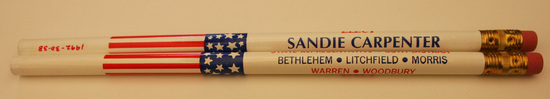 White pencils with red and blue printing and designs on them "Elect/Sandie Carpenter/State Representative - 66th District/Bethlehem Litchfield Morris/Warren Woodbury" American flag on lower half. Brass colored eraser holder.
