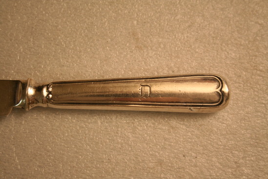 7 silver knives. Rounded blade. Thicker, rounded handle. Simple recessed line design on each side of handle. "D" engraved in script in center of handle on front. Maker's mark "Marquand & Co" stamped on back of blade