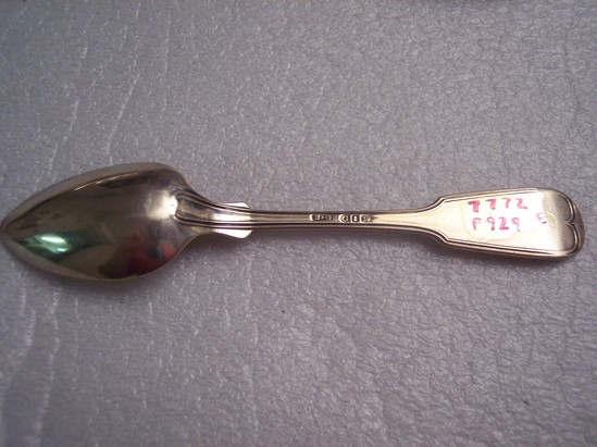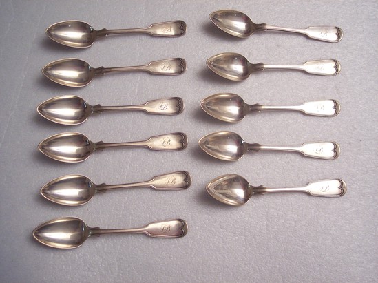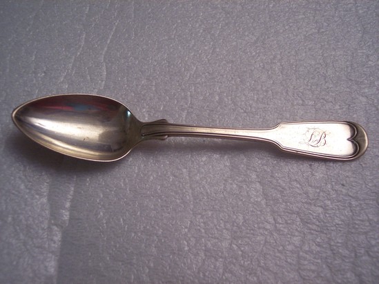 16 silver teaspoons, Ensko shape & Kovel 1810 form. Flared, joined, and beaded handle. Flaring at top to large tab with "LB" initial in script and round end with single beading in heart shape