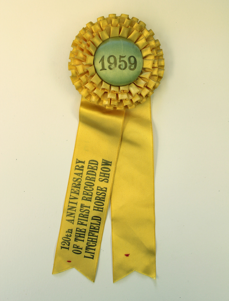 Yellow satin ribbon with rosette of yellow satin on top, circular button in center. Button stamped at center in gold lettering, "1959." Two satin tails extending below rosette; left tail stamped with gold lettering, "120th ANNIVERSARY/OF THE FIRST RECORDED/LITCHFIELD HORSE SHOW." Metal hook on reverse with blue and white paper label for Pegasus Sales Co., New York, NY. Written in pencil on reverse of left tail, "in Hack class/on Missy."