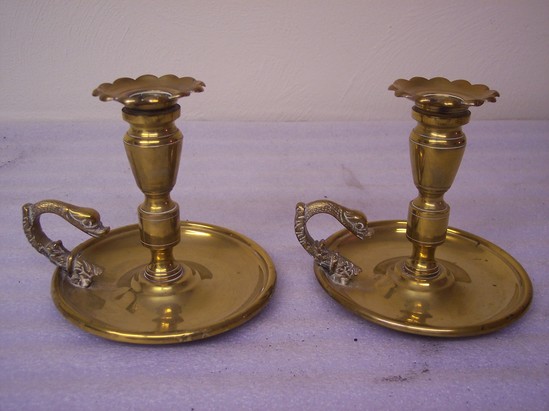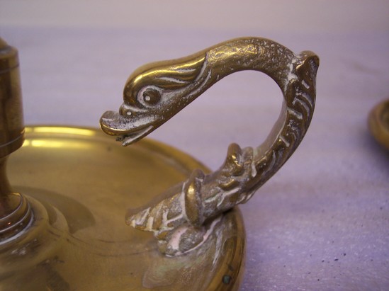 Saucer base with duck finger hold, scalloped stem. Fluted lip around opening at top.